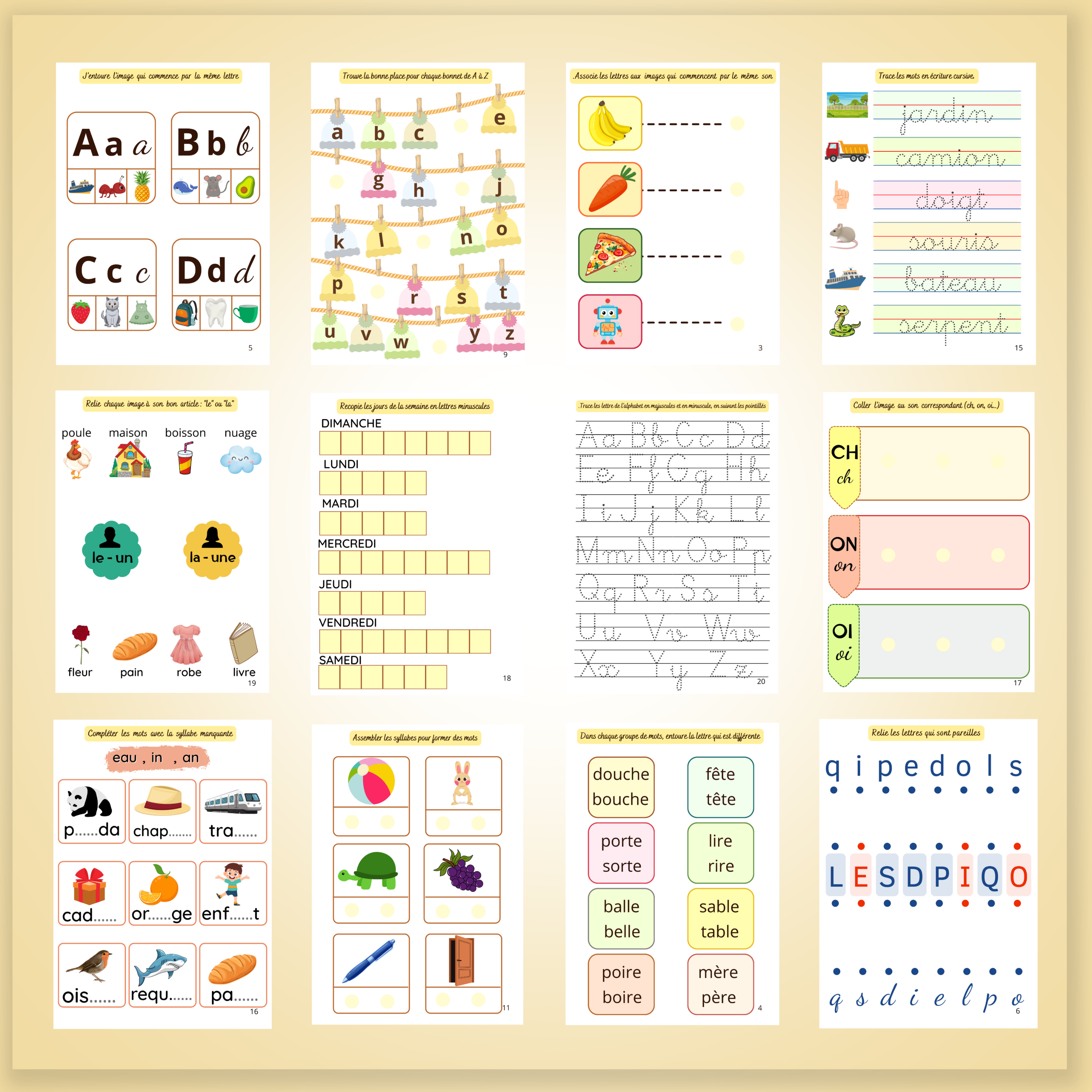 Un livret éducatif complet pour accompagner les enfants dans l’apprentissage du français ! À travers des activités ludiques et progressives, l’enfant découvre les sons, apprend à lire, à écrire et à reconnaître les lettres et les mots.