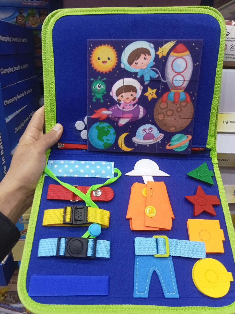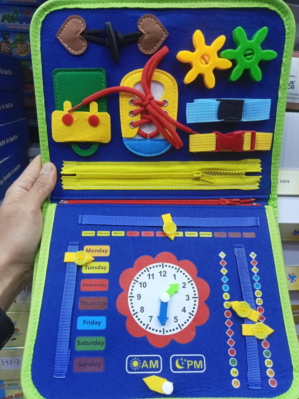 Ce busy book contient plusieurs jeux éducatifs pour occuper l’enfant pendant des heures :